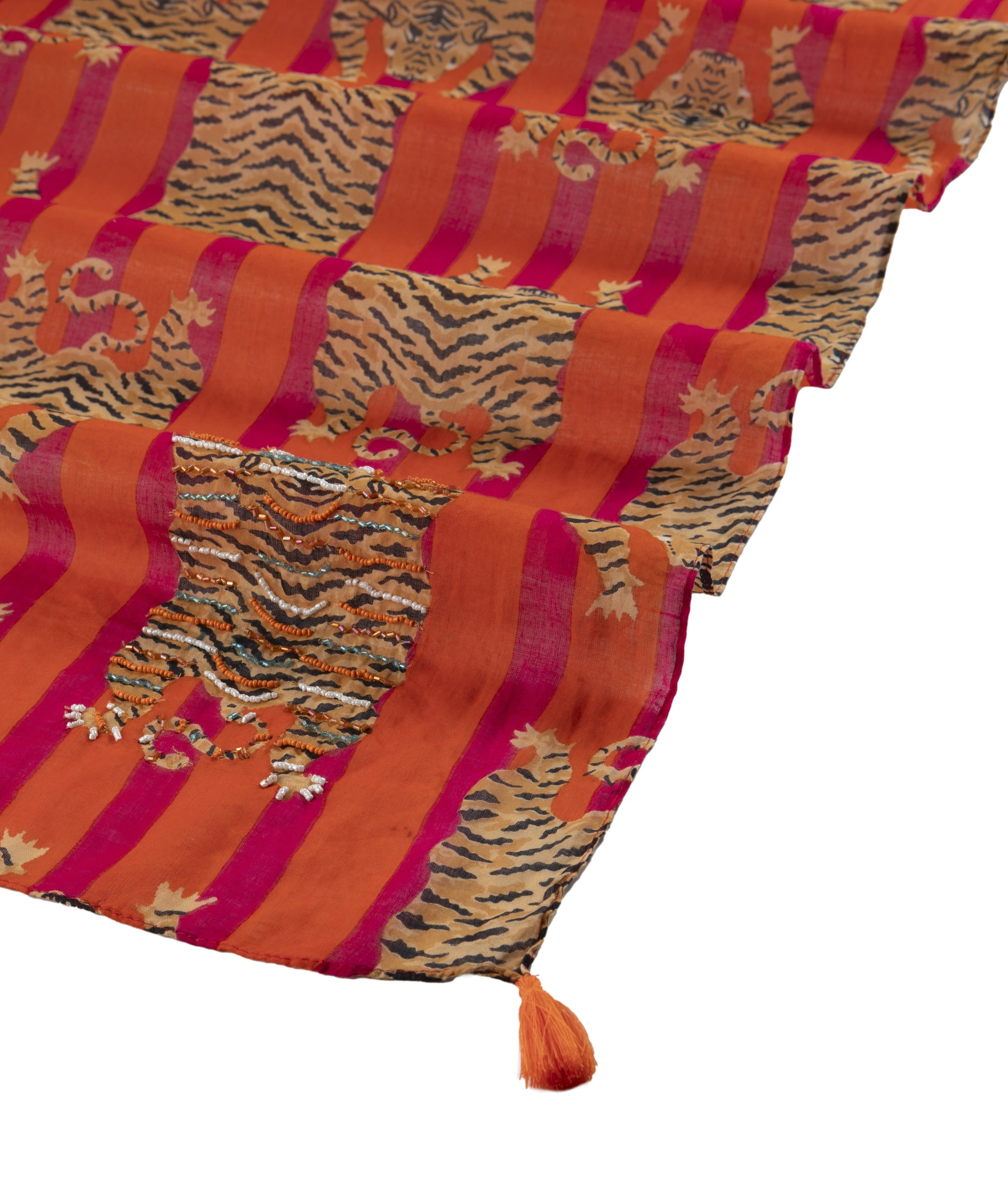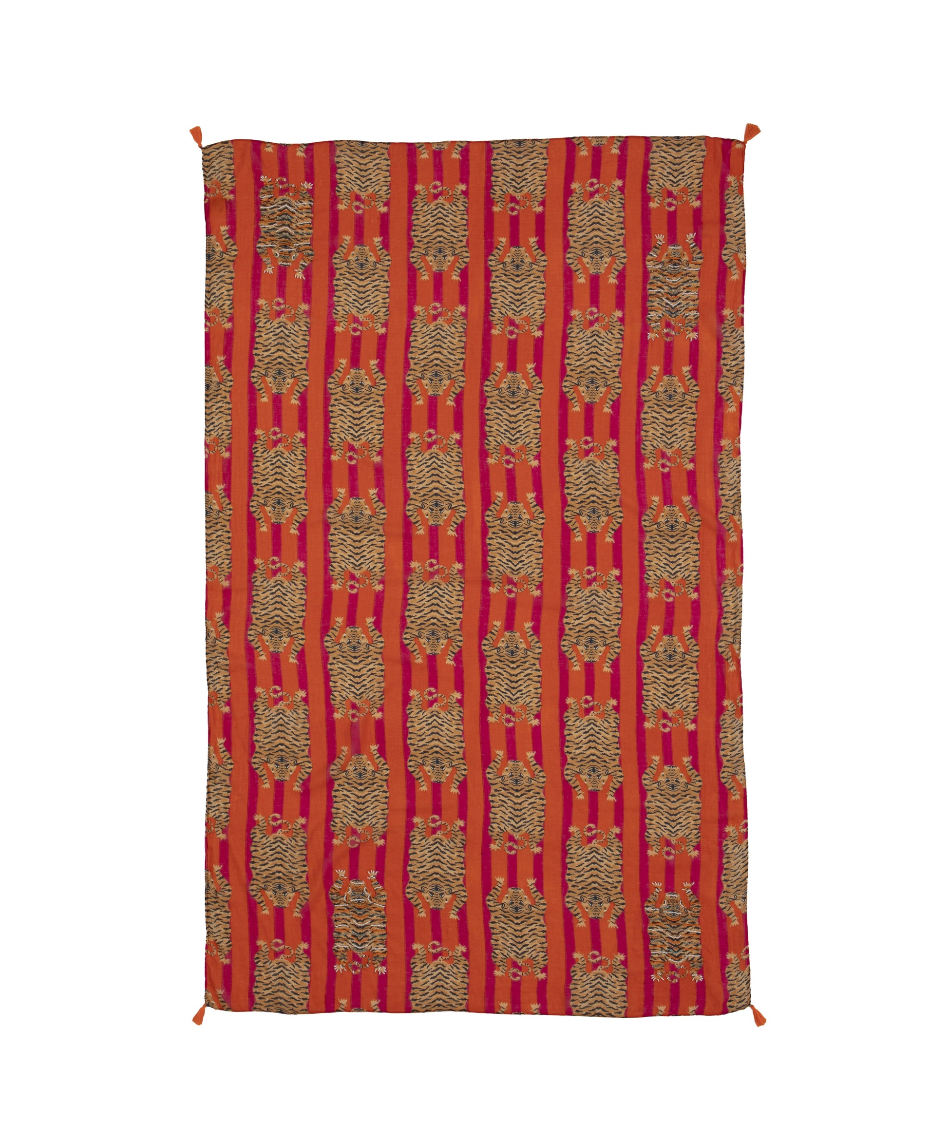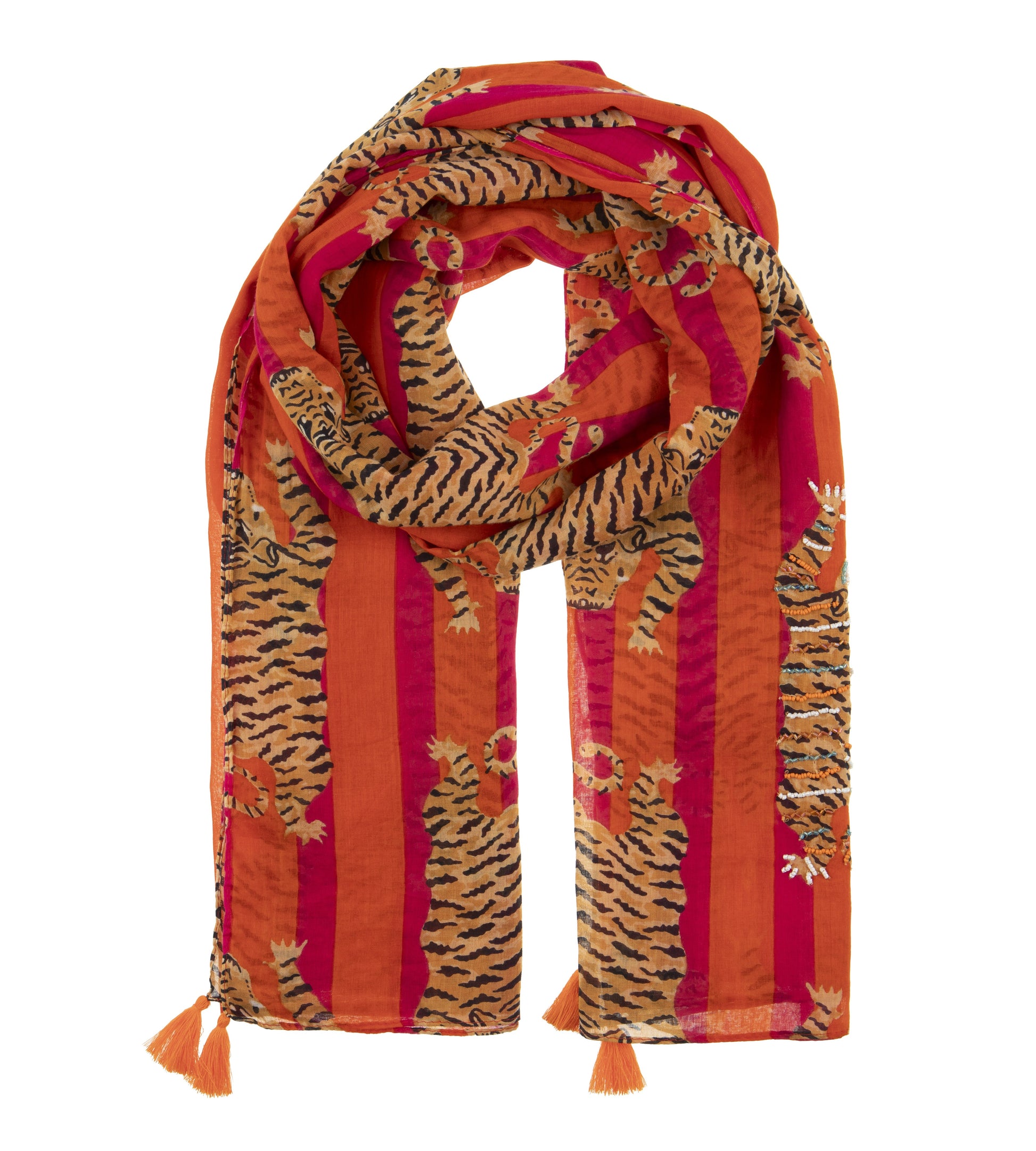Dieser leichte Schal mit auffälligem Tiger-Print ist das perfekte Accessoire für einen stylischen Look! Die leuchtenden Rot- und Orangetöne kombiniert mit dem exotischen Muster machen ihn zu einem echten Hingucker. Hergestellt aus weichem, luftigen Stoff, bietet er angenehmen Tragekomfort und vielseitige Styling-Möglichkeiten. Die dekorativen Quasten an den Enden verleihen dem Schal eine besondere Note. Ideal für den Alltag, den Urlaub oder als Statement-Piece!